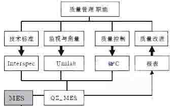 在质量管理与MES整合过程中,首先在基于质量管理标准的基础上,在MES系统中分别建立了Iterspec、Unilab、SPC、报表四个功能模块(图1), 组成质量管理系统(QZ_MES),分别承担不同的功能。通过各功能模块与质量管理职能的衔接,以及各功能模块间的交互作用, 从而实现质量管理的闭环式管理。