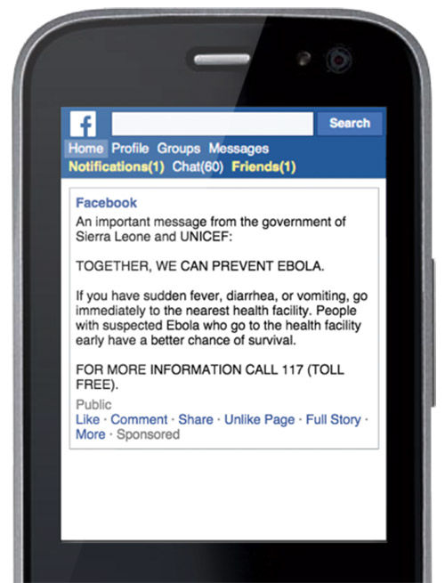 后,除了通信服务,Facebook将与联合国儿童基金(UNICEF)合作,帮助教育西非公众了解埃博拉病毒的症状和治疗方法。具体来说,相关教育信息将出现在“受影响和周边地区”用户的Facebook页面上。这些信息只限于某些区域内,内容涉及“埃博拉病毒检测、预防和治疗。”