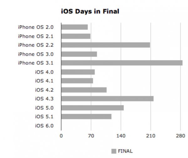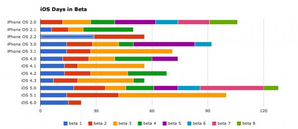 Will Hains使用Google的Chart API建立了一个很酷的交互式图表。正如你看到的,一般的iOS主要更新都会发布5至8个beta版本。iOS4是iOS系统史上重要的一次更新,它的Beta版本测试了74天,苹果发布了5个iOS4的beta版本。