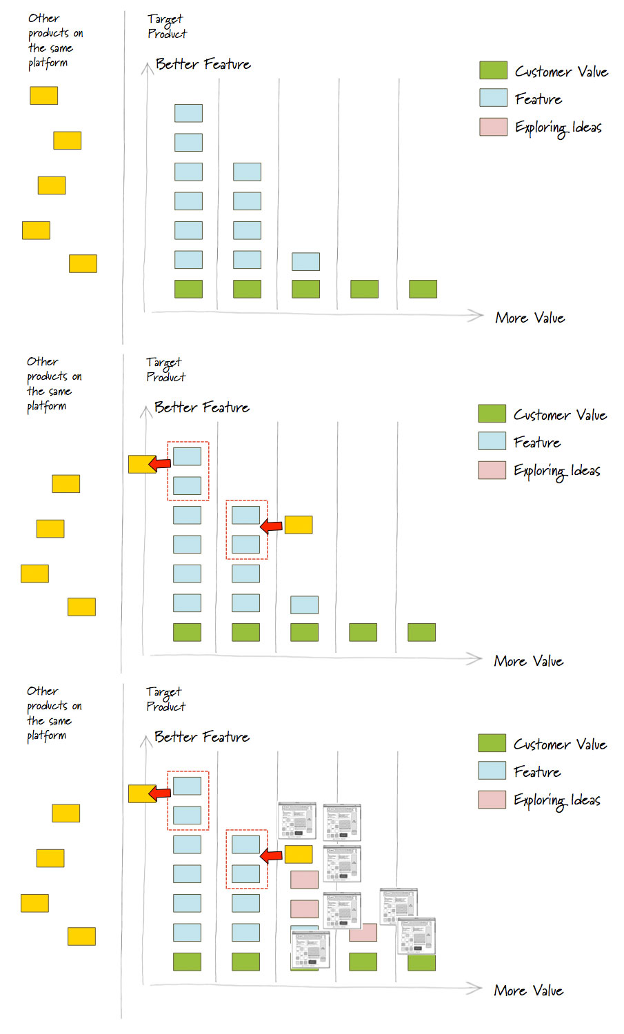 将现有平台的已有产品进行关联,如果产品A中某个功能对当前产品某个用户价值可以吸引客户,将这个产品卡放在左侧并用箭头表示客户转移,反之亦然(参考第二副图);