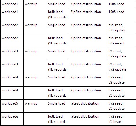 对于数据载入,workload[1-5]-warmup或者workload[1-5]文件都可以使用,需要根据具体的需求载入类型选择。5种负载中的每一个都会被分为一个针对终结果的负载文件和一个在真正运行测试之前运行的预热文件。为了避免和YCSB的内部访问记录控制部分冲突,预热阶段将不会进行插入操作。通过一个线程扩展的测试,我们发现每个YCSB实例将会使用64个线程对于所有的3个系统都是表现好的。