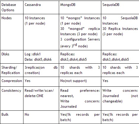 所有的系统都运行一次单条载入,一次预热还有一次正式测试。对于支持批量载入的系统,MongoDB和SequoiaDB,还有一项批量载入的测试要运行。