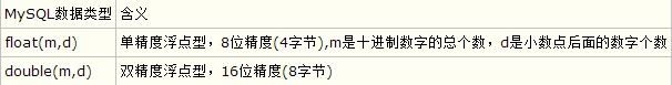 decimal(m,d) 定点类型浮点型在数据库中存放的是近似值,而定点类型在数据库中存放的是精确值。参数m是定点类型数字的大个数(精度),范围为0~65,d小数点右侧数字的个数,范围为0~30,但不得超过m。对定点数的计算能精确到65位数字。
