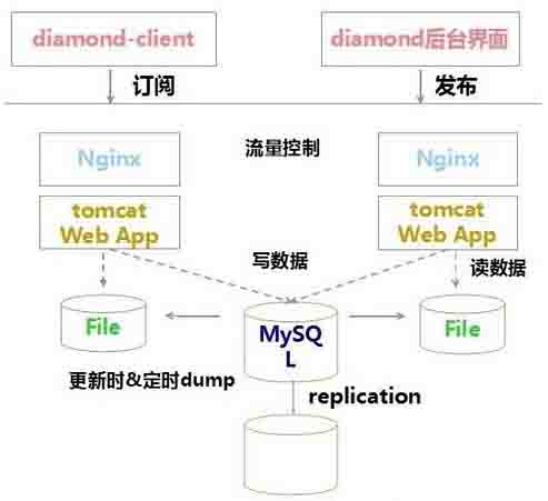 Diamond的架构非常简单,服务端采用本地文件+集中式mysql的方式保存配置信息,采用tomcat作为运行容器,nginx作为流量控制。