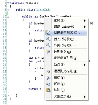 将鼠标移动到GetMax类名上面,右键,选择选项,创建单元测试,如下图: