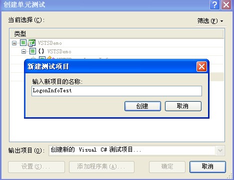 这时候会弹出一个"创建单元测试"的操作框,我们直接点确定,然后输入新项目的名称LogonInfoTest,如下图: