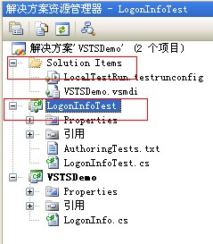 确定完成后,vs会自动生成LogonInfoTest测试项目与一个Solution Items文件夹,且自动在LogonInfoTest项目下生成一个LogonInfoTest.cs文件,如下图: