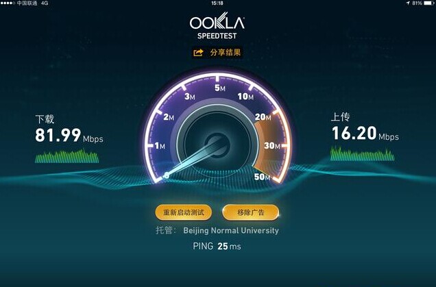 中关村步行街:在测试的五个点当中,中关村步行街的上行下行速度是快稳定的,地处北京科技公司集中的区域这很合乎情理,所以也没有什么可赞扬的,这是运营商基本的义务。实测的下行速率为81.99Mbps(约合10MB/s),上行速率为16.2Mbps(约合2MB/s)