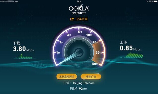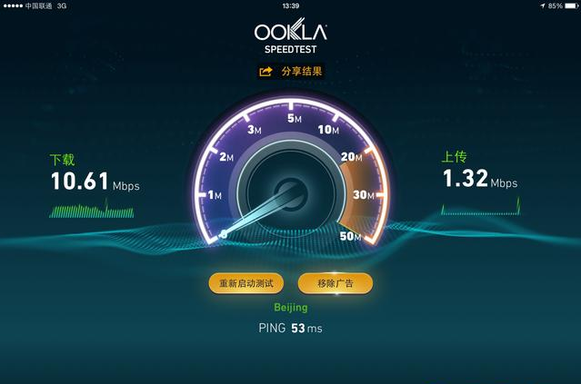北京北五环:由于地处北五环加上又是室内连接,信号不好可以理解,实测下载速度为3.8Mbps(约合480KB/s),上传速度为0.85Mbps(约合106KB/s)。