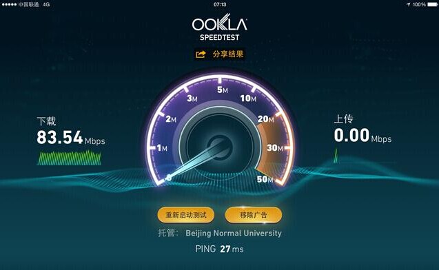 首都机场T3:在登机口长时间等待是不少用户都会经历的空闲时间,这段时间也是用户常使用iPad的环境之一。由于特殊建设原因,在首都机场T3的测速令人欣慰,实测下载83.54Mbps(约合10.4MB/s),不过上传速率几乎为0。