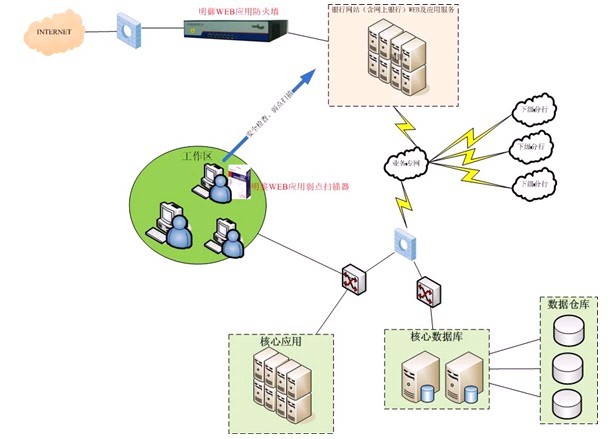 面对外部的WEB应用风险,应从两个方面来进行解决,第一方面是了解目前现有网上银行及WEB网站存在的安全漏洞,可通过安恒的WEB应用弱点扫描器了解已知的WEB应用系统(WEB网站、网上银行、其它B/S应用)存在的风险,通过扫描器发现的漏洞进行加固防护。第二方面通过部署明御WEB应用防火墙抵御互联网上针对WEB应用层的攻击行为,提高网上银行的抗风险能力,保障网上银行的正常运行,为网上银行客户提供全方位的保障,详细部署情况参见下图。