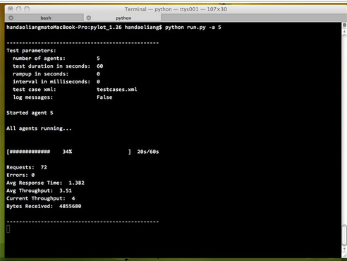 配置好了之后,运行:python run.py -a 5即可以开始进行压力测试,这里参数“-a 5”的意思是:运行5个Agents。