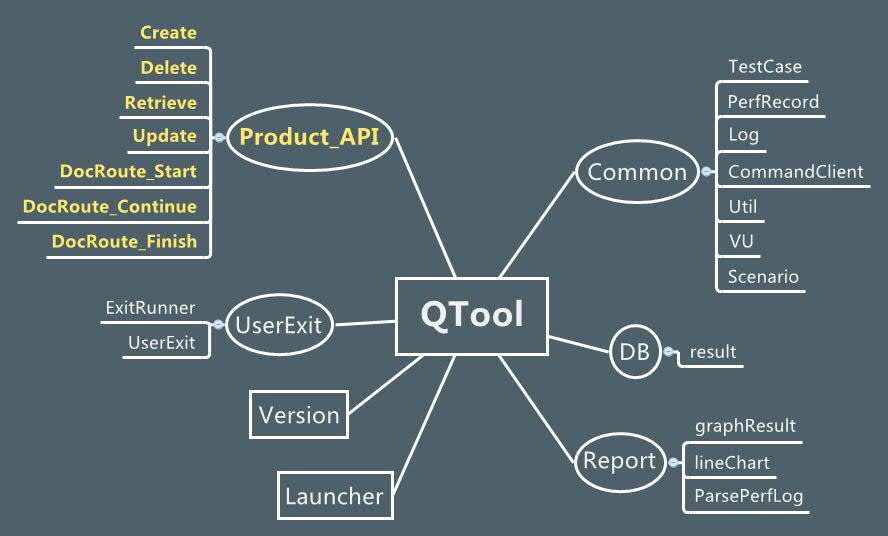 先撇开被测产品的API不谈,整个工具暂且称作QTool。主要组成部分是Common,DB,Report以及User Exit4个大部分,另外还有关于版本以及Launcher部分。
