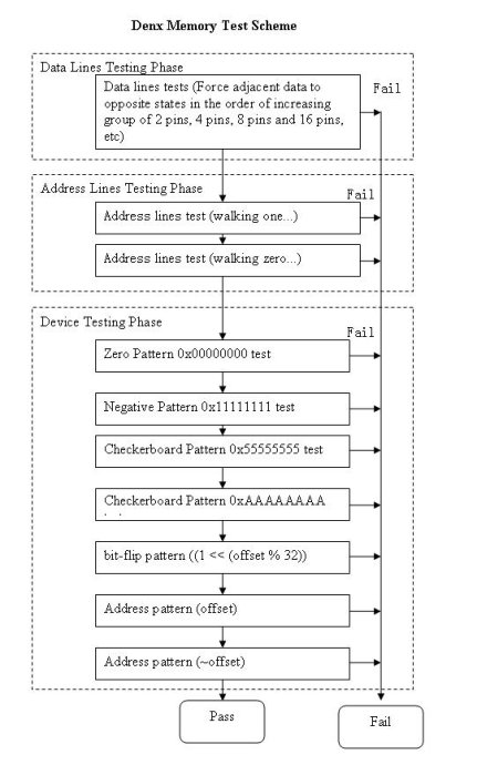 因为如果数据线是断开的,那么一切无从谈起!接下来是检测地址线,只有数据线和地址线都通过,检测内存的存储单元才有意义,这样的流程也利于分割定位问题。上面testing sequence框图将整个检测过程分成三大步,用三个虚线方框表示。