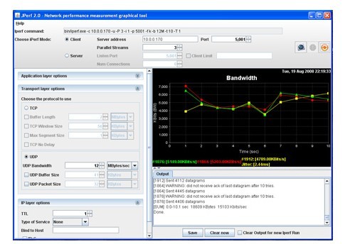 如本文介绍的,iPerf程序可以在命令行下运行,它或者也在一个名为JPerf的Java实现前端工具上运行。JPerf不仅能简化复杂命令行参数的构造,而且它还保存测试结果——同时实时图形化显示结果。