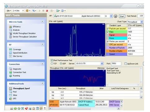 事实上,iPerf测试工具被嵌入到一些其它的网络流量分析工具中——包括底层LAN分析工具,如AirMagnet。比如,在下面的屏幕截图中显示了一个Wi-Fi笔记本上运行的AirMagnet作为iPerf客户端与安装在有线网络上的常规iPerf服务器进行交互的情况。