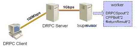 DRPC Topology由一个DRPCSpout,CPPBolt和一个ReturnResult组成。功能是接收一个字符串并返回。