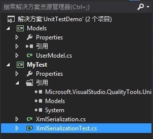 由于我这个项目是对Xml序列化进行测试,因而前提是项目中已存在了一个UserModel类,并且在单元测试项目中添加相应引用