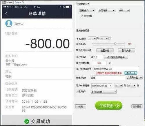 根据网络曝光的截图,微商可以利用“微信对话生成器”、“支付宝转账截图生成器”“网银转账截图软件”等系列软件营造微店生意火爆的假象,骗取消费者信任。