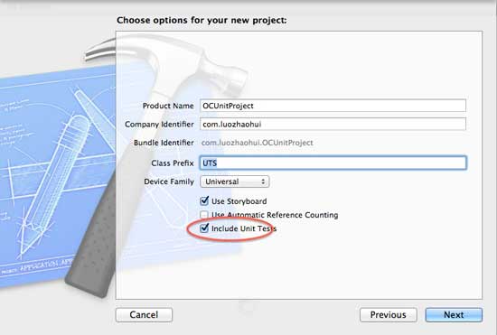 在 XCode 下新建一个 OCUnitProject 工程,选中 Include Unit Tests 选择框,