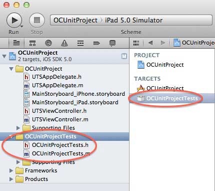 OCUnit 框架则会为我们自动添加 Unit Test 框架代码:
