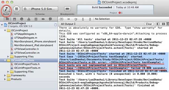 从图中的红色下划线部分可以看出,测试没有通过,符合预期。我们只要像类 OCUnitProjectTests 一样编写继承自 SenTestCase 类的子类,在其中添加形式如:- (void) testXXX(); 的测试函数既可,注意必须是一个无参无返回类型且名称是以 test 为前缀的函数。