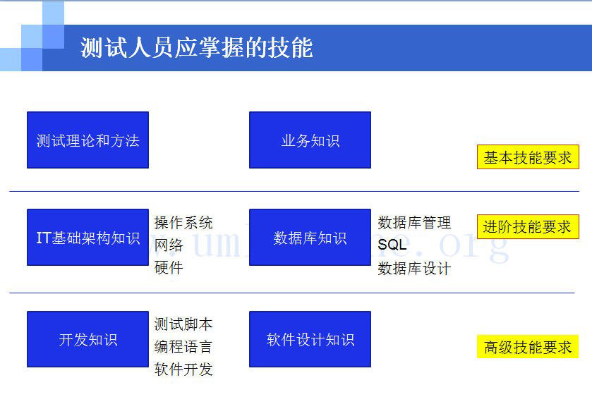 作为项目经理的我,因为正好满足下面你将要看到的技能要求,所以我才能完成上述的4个测试工作。下面我们来看看测试工程师应该具备什么技能?