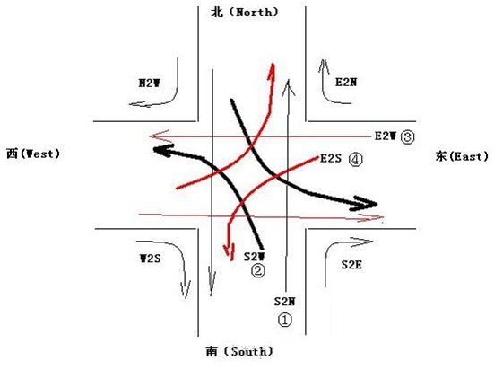 注:南北向车辆与东西向车辆交替放行,同方向等待车辆应先放行直行车辆而后放行左转车辆。