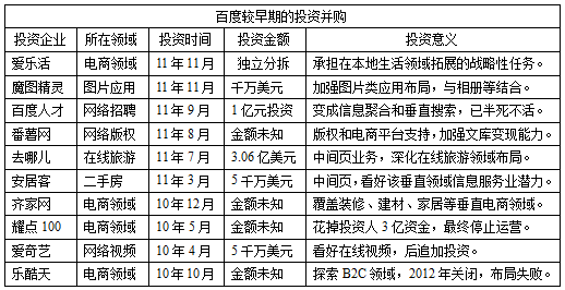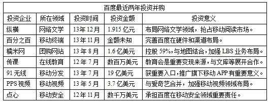 百度副总裁汤和松去年底表示,2013年上半年战略性投资并购集中爆发,出现所谓七大投资并购交易主要有两个原因:PC互联网发展到中后期、移动互联网来袭。往后几年,大的投资并购项目不会集中出现,但未来一两年小的收购仍然是一个活跃期。