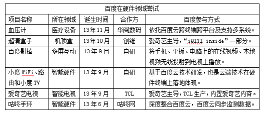 依托百度云平台,百度在智能硬件领域已有一些尝试,如2013年6月推出咕咚网手环,9月推出“小度三件客”:小度WiFi、路由和小度TV,11月联合华阅数码推MUMU智能血压计。百度可穿戴设备网站也已上线,网站显示,还有多款产品处于研发状态。