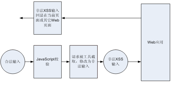 对 WEB 应用进行 XSS 漏洞测试,不能仅仅局限于在 WEB 页面输入 XSS 攻击字段,然后提交。绕过 JavaScript 的检测,输入 XSS 脚本,通常被测试人员忽略。下图为 XSS 恶意输入绕过 JavaScript 检测的攻击路径。