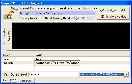 如图2所示: TamperIE 绕过客户端浏览器 JavaScript 的校验,在 POST 请求提交时将其截取,用户可以任意修改表单输入项 name 和 message 的值,譬如将 message 的值修改为 "<script>alert(“XSS hole!!”);</script>",然后点击 ”Send altered data” 按钮,将修改后的恶意数据发送给 Web 服务器。