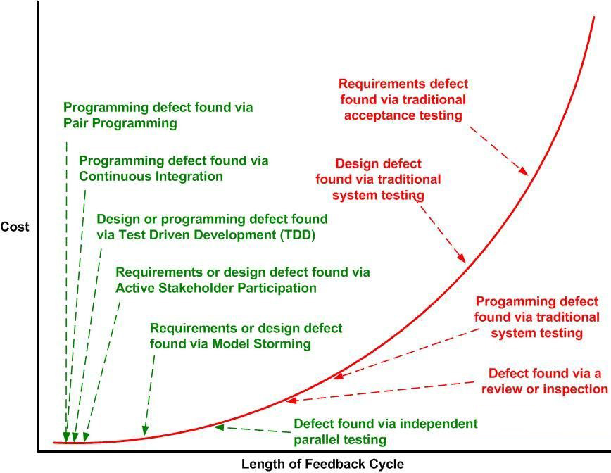 人们对测试初的定义是发现缺陷。大家都会熟悉下面图中的这条曲线:缺陷发现的越晚,修复的代价越大。照这个思路来看,发现缺陷越早越好?什么叫早呢?如果是一般的软件生命周期,那能在需求阶段发现所有缺陷perfect了。这显然是天方夜谭,代码还没写呢,你怎么能发现编码过程中产生的缺陷呢? 缺陷产生于软件生命周期的各个阶段,试想如果在每个阶段的初期能发现这个阶段的所有缺陷也是不错的,但这也是不可能的,再拿编码过程产生的缺陷来说,当一个方法还没有被编写出来,你如何发现它的缺陷呢?解决这个问题有2个思路: