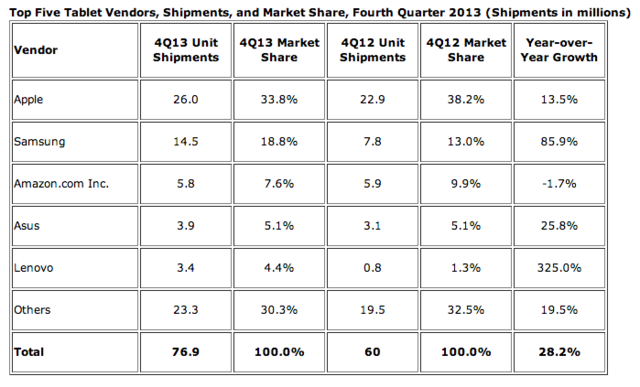 市场研究机构IDC发布的新数据显示,2013年,虽然三星和苹果的平板电脑业务均呈现增长,但三星的增速较苹果更快一些。三星平板电脑业务同比增长86%,占据18%的市场份额。苹果平板电脑业务的增速正在放缓,同比增速仅为13.5%,市场占有率为33.8%。