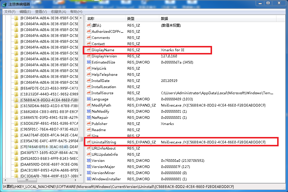 Uninstall下面的注册表子键很多, 你需要耐心地一个一个去查找”DisplayName”, 从而找到程序的ProductCode, 如下图。
