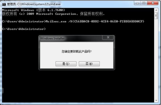 然后在CMD中直接调用这个命令, 会弹出一个对话框,点击”是” 后, 软件能被卸载了。