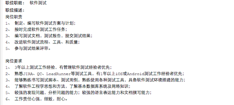 整个移动互联网测试的业出现了一种很奇特的现象。应聘需求量非常大,但是应聘者却不知道以什么样的技能和能力去应聘。相对的,招聘需求量也很大,但是从千篇一律的招聘简章(如上图)中看得出来,大部分的企业和面试官自己都不清楚自己需要什么样子的测试人员。这种情况直接导致了面试过程的不规范性,面试官盲目的考核应聘者。很多企业的测试人员的面试仅仅是编程和算法的面试,当应聘者问自己到企业具体做什么的时候,往往都得不到确切的答案。