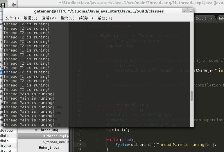 上面例子中, 类 M_thrd_1继承了线程类Thread. 并重写了run方法.