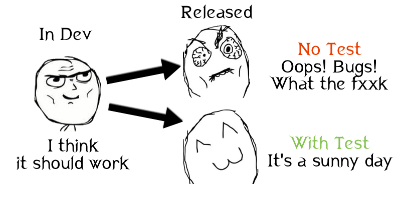 当测试足够全面和具有代表性的时候,我们便可以信心爆棚,拍着胸脯说,这段代码没问题。我们做出某些条件和假设,并以其为条件使用到被测试代码中,并比较预期的结果和实际运行的结果是否相等,这是软件开发中测试的基本方式。
