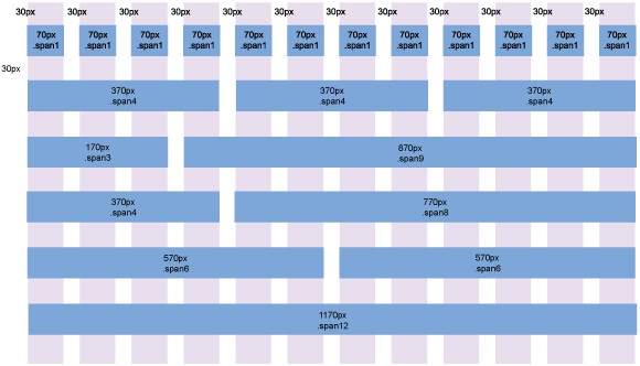 Bootstrap 网格系统的每一行多有 12 块,每两个块之间留有小槽来提供间隔。您可以拥有无限数量的行,每一行的高度任您设置。每个块是 70 像素宽,小槽是 30 像素宽。Bootstrap 还为页面正文设置一个 30 像素的左边距。网格系统的设计目标是进行基本的布置并为您分配空间,因此,在理想情况下,您只需关注要在网格中放入什么即可。