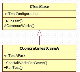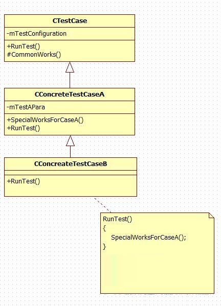 继承的方法RunTest用来实现具体的对特性A的操作,包括对特殊操作封装函数SpecialWorksForCaseA的调用;