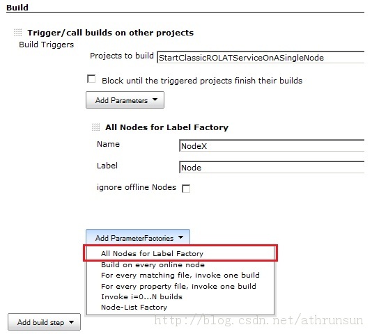 (2)NodeLabel Parameter Plugin(https://wiki.jenkins-ci.org/display/JENKINS/NodeLabel+Parameter+Plugin):在所有“Possible nodes”标有指定标签(“Label”)的Jenkins节点(是Jenkins master或Jenkins slave)上触发指定project(被触发的project是参数化的)。