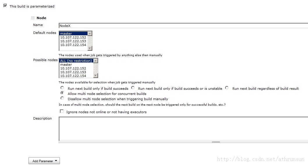这个project有一个Node类型的参数,参数名“NodeX”与之前Label Factory中的“NodeX”对应,“Possible nodes”选的是“ALL”,那么列出的所有node(master、10.107.122.152、10.107.122.153、10.107.122.154)都在判断范围之内(判断其是否有“Node”标签,有则执行project)。