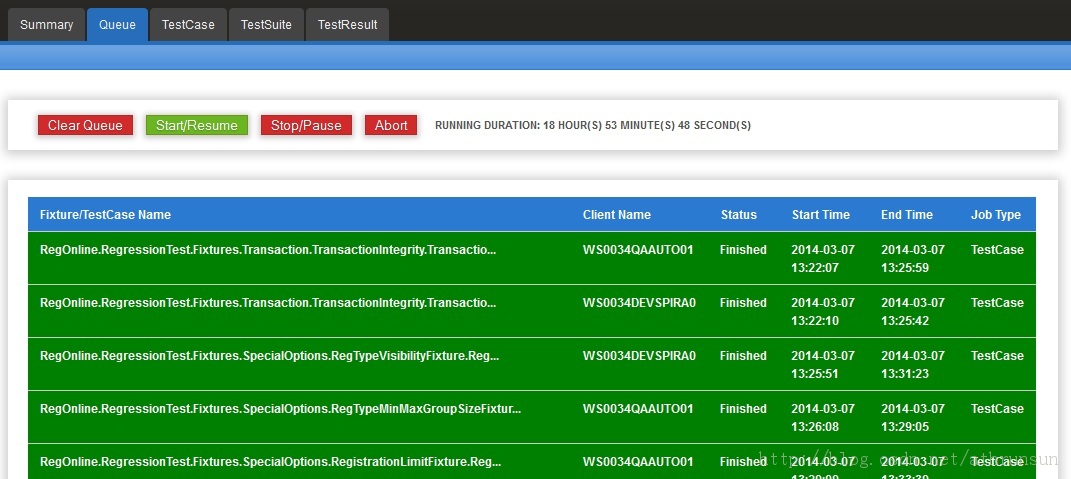 b、Queue,测试队列,包含当前正在运行的、运行完的、等待运行的test fixture或test case(依据测试工具的不同,NUnit、JUnit、RSpec等,fixture的叫法可能不同,总之是包含多个test case的集合)。可以启动、停止、终止(终止之后可以清空)测试执行或清空当前队列。