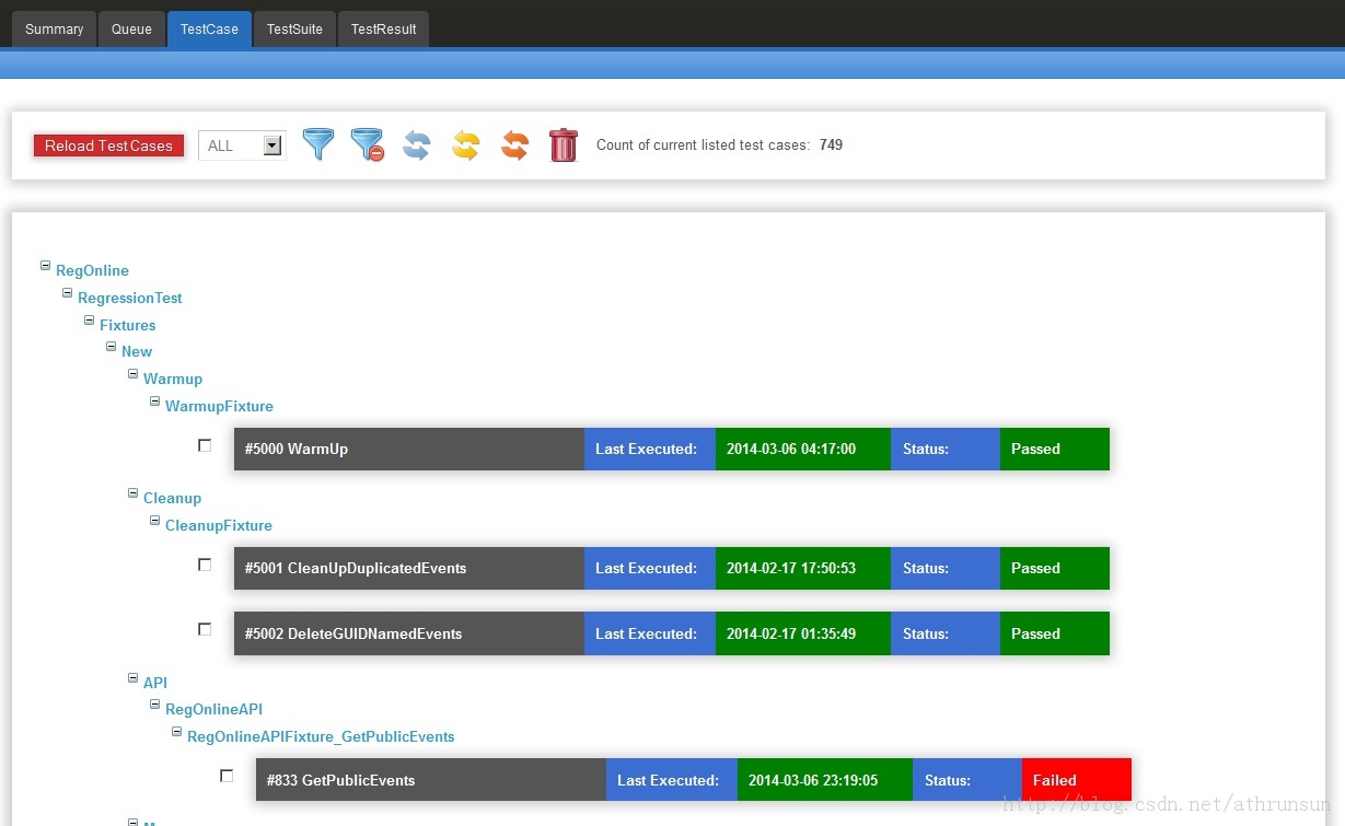 c、TestCase,生态系统中的所有测试用例会展示在这里,可以看到它们后一次执行的时间和状态(pass/fail),点击某条case可以跳转到该条case的所有test result。可以按状态(pass/fail/other)筛选用例,可以勾选部分用例重新执行、或重新执行所有fail的case。“Reload Test Cases”主要是考虑到*.dll文件中的test case可能会在某次部署之后发生变化,需要重新加载。不过后来我修改了Jenkins里的job在每次部署之后都自动重新加载,所以这个按钮其实没什么用了。