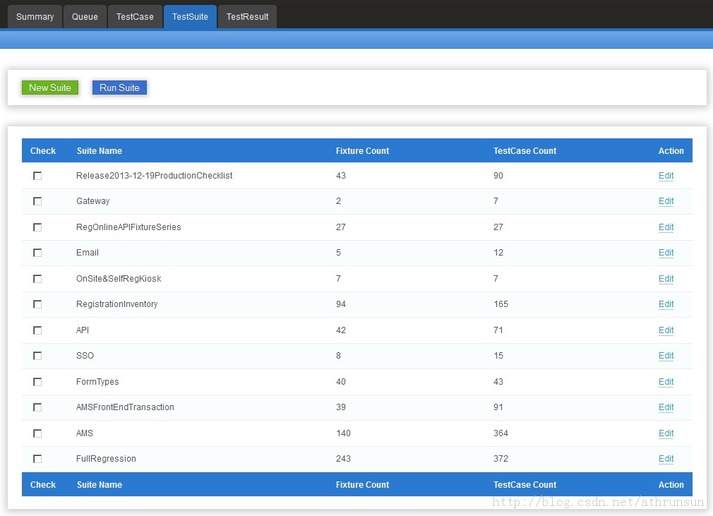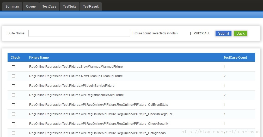 d、TestSuite,包含多个fixture的集合是一个suite。勾选多个suite点击“Run Suite”即可把这些suite中包含的fixture添加到Queue。