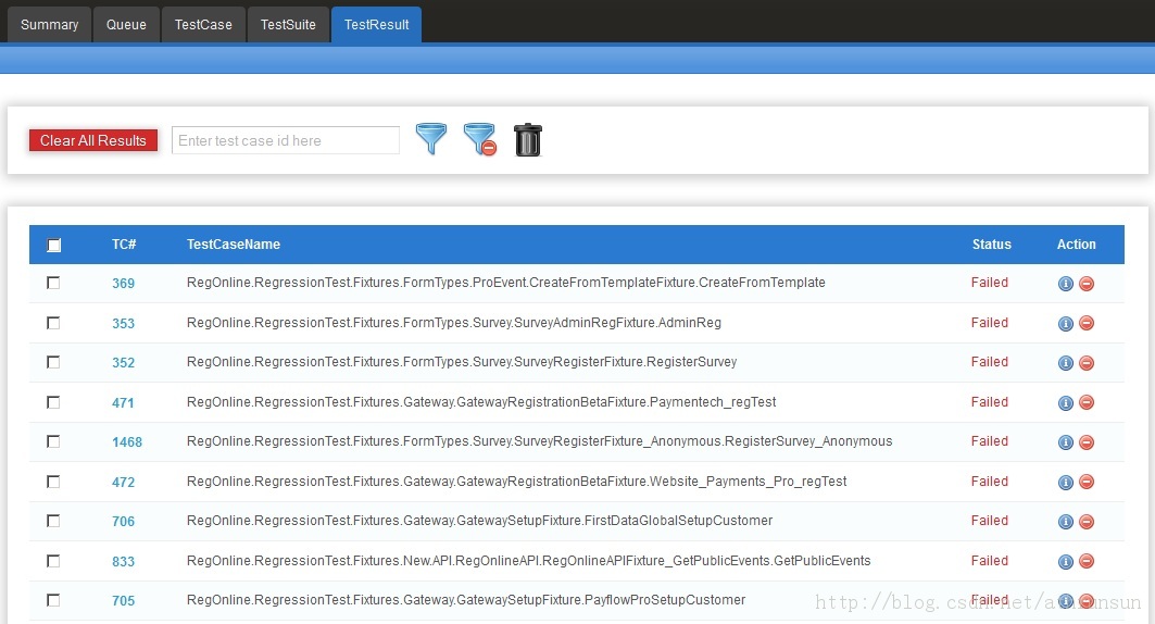 e、TestResult,展示所有test case的运行结果,可以按test case id进行筛选,点击TC#这一列的id只显示这条case的结果。