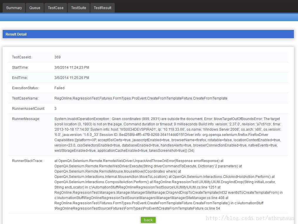 点右边的蓝色“i”图标可以跳到这条结果的详细页面,截图功能暂未启用,根据RunnerMessage和RunnerStackTrace可以知道报错的代码位置,进而尝试重现问题。