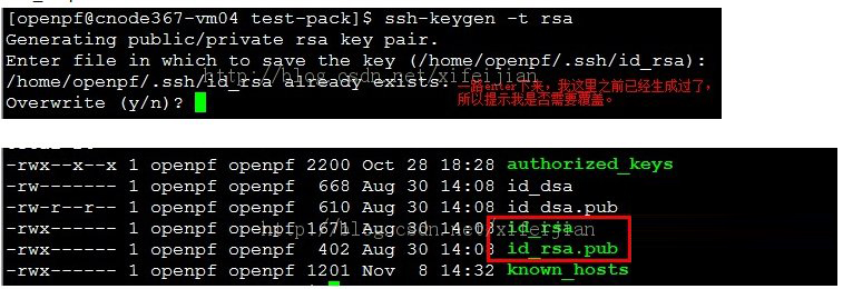 1.在 A 上运行 ssh-keygen -t rsa 在/home/openpf/.ssh下生成id_rsa 和 id_rsa.pub 两个文件,然后在/home/openpf/.ssh下复制备份一份id_rsa.pub 命名为 id_rsa.pub.A,以便拷贝到服务器B,如图所示: