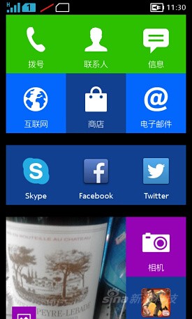 相比WP系统不同的是,诺基亚X的界面由多种颜色区域组成,而非前者必须统一为整体主题配色。所以,你会看到诺基亚X主界面从上往下滚动时由绿色、蓝色、粉色、黄色多个区域。